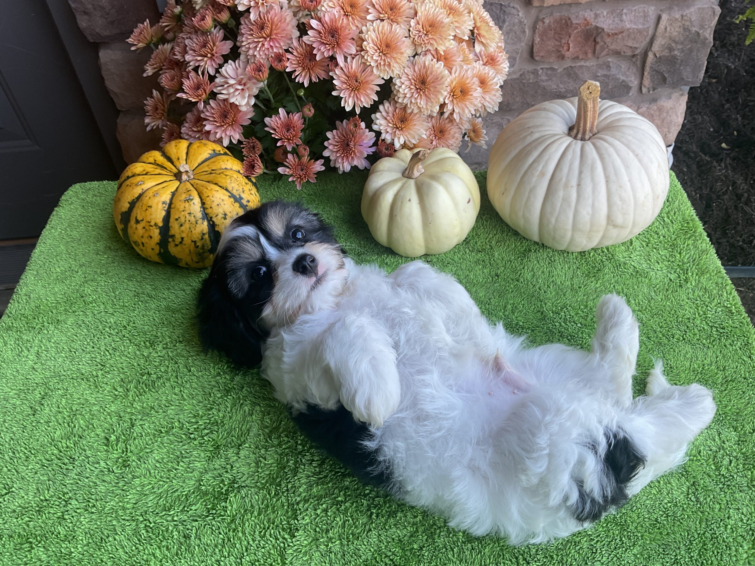 What a beautiful little guy Snickers is his wonderful colors and hair coat Makes him very, very cute and also his personality explains everything. Make sure and watch the video. Snickers will probably be between 14 and 16 pounds adult size For any additional questions, please contact Leroy with charming puppies